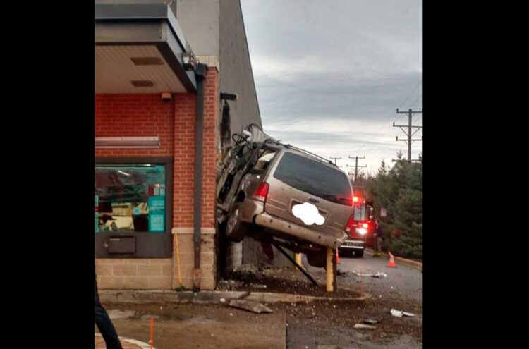 The van went partially inside the building and was balancing on the top of a protective barrier.