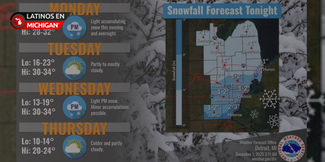 Detroit, MI — El Servicio Meteorológico Nacional (NWS Detroit) informó que el clima frío persistirá durante toda la semana mientras un nuevo sistema de nieve avanza sobre la región entre la noche de este lunes y la madrugada del martes.