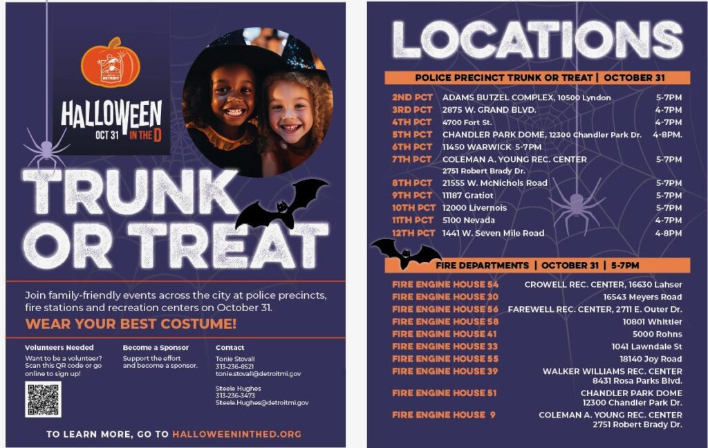 • 31 de octubre – Noche principal de Halloween: Múltiples actividades en recintos recreativos de la ciudad; por ejemplo, 14 centros de recreación tendrán “casa encantada”, juegos de feria, estaciones de fotos, pintura de cara, DJs, etc. Horarios varían según el centro. Además, habrá eventos de “trunk-or-treat” organizados por la Detroit Police Department y la Detroit Fire Department en sus distintas sedes.