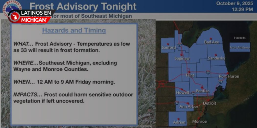 Detroit, MI — Las autoridades meteorológicas han emitido un aviso de heladas para gran parte del sureste de Michigan, vigente desde la medianoche hasta las 9:00 a.m. del viernes. Se espera que las temperaturas desciendan hasta los 33 °F (alrededor de 0.5 °C), lo que podría provocar la formación de escarcha en zonas rurales y suburbanas.